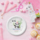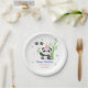 Cute baby panda kids birthday paper plates featuring an adorable panda wearing party hat with a panda footprint, bamboo and stars at the background.