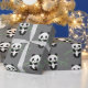 This cute wrapping paper features a whimsical pattern of panda bears climbing bamboo in grey.
