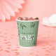 These contemporary but cute baby shower personalised paper cups feature watercolor deep green foliage leaves framing the text 'BABY' with two playful panda bears on a neutral eucalyptus green background with name and date.