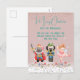 This custom holiday postcard features a cute and festive Nutcracker Christmas theme. A watercolor style image of a the Nutcracker solider, Mouse King, and Sugar Plum Fairy ballerina is pictured in the centre. Snowflakes are falling across the Winter sky and snow covers the ground at the bottom, accented with faux silver glitter. Faux rose gold glitter is sprinkled across the top. The background is a retro style pastel pink with teal coloured text.