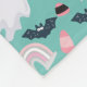 A playful Halloween seamless pattern featuring smiling ghosts, pastel rainbows, candy corn, bats, pumpkins, stars, and witch hats on a teal aqua background. The design combines spooky and sweet with a modern pastel colour palette of pink, white, black and peach, making it perfect for kids’ Halloween decor