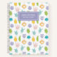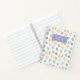 This adorable notebook features a fun pattern of hand drawn monsters in purple, lime green, aqua, gold, orange, and light pink. Great for Back to School and easy to personalise for a great gift! The back contains simple diagonal white stripes over a matching lavender purple.