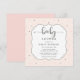 This baby shower square invitation features a pastel polka dot pattern with a decorative frame on a blush pink background.