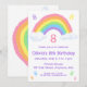 A chalk-style, pastel-rainbow-and-clouds, birthday-party invitation. The rainbow and large pink number also appear on the back of the invitation.