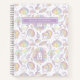 This adorable notebook features a fun, whimsical pattern of little girls, icecream cones, paintbrushes, lions, and feathers in a light pastel rainbow colour scheme. Great for Back to School! Easy to personalise for a great gift! The back contains simple diagonal white stripes over a matching lavender purple.
