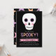 This super cute Halloween inspired birthday slumber party invitation features a hand drawn skull, with pastel pink and purple accents. Pastel peach is also incorporated in the design. Text reads, "It's time to get SPOOKY!" in a modern, multicolored font! The back of the card contains pink, purple, and peach stars over a black background.