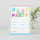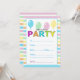 Cute birthday party invitation featuring horizontal stripes in a colourful pastel palette. TA row of bright pastel balloons is at the top of the invite. and the word PARTY is on bright multi coloured lettering. Spaces to add all your party details for a fun day.