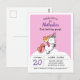 Pastel and pink postcard birthday invitation featuring a cute chubby baby unicorn standing on a cloud.