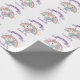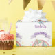This cute and colourful wrapping paper features a beautiful illustration of a unicorn and pastel coloured rainbow. Little stars in matching colours surround the rainbow. A sample Happy Birthday banner is printed above the unicorn, and a sample name is printed below in an elegant purple script font. You can personalise the gift wrap to include your own custom name or text.