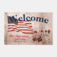 Add your name, family in a script font and first in block font, in red on a vintage weathered-looking beigy background dominated by a flying American Flag and a cute hand-drawn black-and-red fife and drum band. "Welcome" is inscribed in a bold, deep blue font across the top of the design.