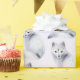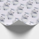 Wrapping paper with a watercolor image of a white fox with fancy blue flora designs all over its fur.
