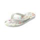 Flip flops with a whimsical pattern featuring a collection of delightful children's toys and animals.
