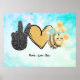 Cute design with "Peace Love Bees" text, sparkly black peace hand symbol, gold doodle heart and whimsical bee on a background of watercolor clouds.