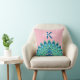 Cute throw pillow with a colourful cartoon peacock against a pink background. Personalise with name in white and initial in blue. Perfect as nursery decor!