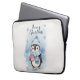 A charming winter illustration of an adorable little penguin wearing a blue striped hat and scarf, bringing a cosy and festive vibe. The soft snowflakes and gentle blue tones in the background create a magical winter atmosphere. Perfect for Christmas cards, posters, stickers, and seasonal crafts!