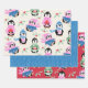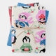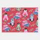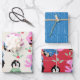 Cute wrapping papers sheets . Two features a penguin pattern : one has cream colour , the other is red . The third is blue with a stripe pattern .