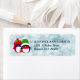 Two cute little penguins stand huddled together against an abstract bokeh blue snowflake background. Each of the penguins is dressed in red and green winter scarves and hats. Your custom text is in darker blue grey at the right.