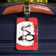 A cute penguin wedding luggage tag featuring 2 penguins, the bride penguin is dressed in a white wedding dress with a heart tiara veil carrying a red rose bouquet and the groom penguin with a red bowtie and top hat with a red band surrounded by floating red hearts topped with a red sash and bow!