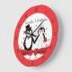 A cute penguin wedding wall clock featuring 2 penguins, the bride penguin is dressed in a white wedding dress with a heart tiara veil carrying a red rose bouquet and the groom penguin with a red bowtie and top hat with a red band surrounded by floating red hearts topped with a red sash and bow!