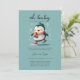 A sweet, magical, gender neutral baby shower invitation template with a penguin and winter sports theme, featuring a watercolor illustration of an adorable penguin skating, over a minty teal background and the title "oh baby it's cold outside". Simple and elegant, for a mother (or parents) to be who loves penguins and is celebrating her baby shower in the winter months.