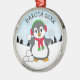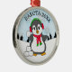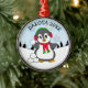 A cute funny hand drawn cartoon penguin throwing snowballs adorable personalized Christmas ornament, with snowflakes background.
