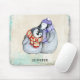 A personalised mouse pad with an adorable illustration of a penguin couple cuddling together. Wearing winter scarves and hats. Set on a cream coloured vintage texture with turquoise accents along the edges.
