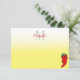A cartoon style chili pepper. Custom note cards with monogram. White and yellow background. Edit initial and name to customize.