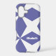Design featrues a funky retro geometric pattern in periwinkle blue and white. Personalise with custom name, initials or text or delete text. Easily customise background colour in design tool for a truly unique option!