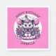 Adorable personalised Happy Birthday possum themed birthday party napkins. A cute possum in a pink and purple birthday hat, with gifts and balloons celebrating a birthday.