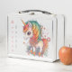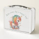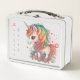 Cute personalised rainbow unicorn lunch box with name on front. The back says: Make every day a magical day!
