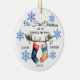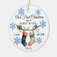 This personalised family of two Christmas ornament is perfect for celebrating Newly Weds or engaged couple's First Christmas or commemorating the First Christmas of 2025. The design features socks hanging on a branch, giving off a festive and cozy vibe. This ornament is relevant to families with a new baby or families of four looking to add a special touch to their tree during the holiday seaso