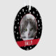 Cute stylish paw print Christmas ornament design for pet cat (or dog) name and photo of furry family member. This cute design features Background with modern black and white pet paw print pattern and a festive red accent stripe. This modern black and white pet paw print pattern will be perfect as personalised gift.