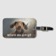 "Where we going?" text over a cute dog photo (can be changed to your dog) on a fun luggage tag with a slot for a business card on the back.