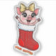 A whimsical hand-drawn illustration of a cheerful cartoon piglet peeking out from a festive red Christmas stocking. Featuring big sparkling eyes, rosy cheeks, and a bright yellow bow, this playful artwork is inspired by classic children’s book styles. The knitted stocking texture with fluffy white trim adds warmth and holiday charm.