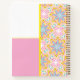 The artist's pattern design of pink and blue flowers is on the side of the notebook, front and back. On the other is a white and pink square with a yellow line in the middle. And the texts can be personalised by the customer.