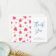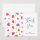 A flat thank you card with a cute pattern composed of pink and green hearts on a white background. Personalise with your own message on the back.