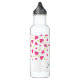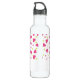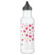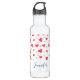 Personalised water bottle with a cute pattern composed of pink and green tumbling hearts on a white background.