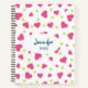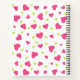 Personalised spiral notebook with a cute pattern composed of pink and green tumbling hearts on a white background.
