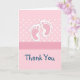 Thank You card with a darling image of pink baby girl footprints with white polka dots on a pink background set behind the illustration. Message inside which you can change / personalise.