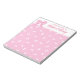 Pretty pink personalised note pad with a pattern of white bows against a pink background. At the top of the girly notepad, from the desk of Your Name, with your name in a beautiful pink script next to a cartoon bow in pink.