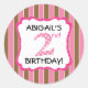 This round sticker features a trendy girl's second birthday theme. The background is light pink and chocolate brown vertical stripes and a swirly frame in the middle features a large pink number two, representing your child's 2nd birthday. Customisable text allows you to add you child's name. See www.zazzle.com/daisylin712 for matching invitation.