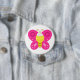 personalize your jacket or bag with this cute pink butterfly button featuring a happy smiling cartoon character. this vibrant pin-back accessory showcases a whimsical insect with magenta wings and a cheerful yellow face, making it a sweet gift for kids and nature enthusiasts. it is a simple and fun way to add a pop of playful garden charm to any outfit or collection.