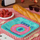 This retro inspired birthday party paper plate features bright blue pool water, a sweet pink doughnut inner tube, and modern typography. This design is a fun choice for any kids pool party... See the collection for coordinating items!