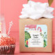 Business thank you stickers with a cute and whimsical pink flamingo. Surrounded by green tropical leaves, and red and yellow hibiscus flowers. A rectangle shaped, gold gradient frame in the centre.
