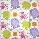 Custom patterned fabric design features a monogram initial and pattern of baby jungle animal friends - a bird, monkey, elephant, and hippo. This modern and sweet safari themed fabric has a colour scheme of bright pink, orange, lime green, purple and grey colours.