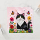 A sweet black and white tuxedo cat sitting in flowers and surrounded by butterflies. The art is in an impasto oil paper quilling style.