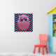Adorable poster with a cute pink owl, wearing purple glasses, and sitting on a pink and blue zigzag chevron pattern