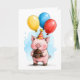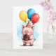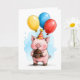 This cute pink pig is here to wish a Happy Birthday with bright balloons of yellow, blue, and red; a yummy chocolate cupcake; and, of course, a yellow and red party hat. This card is a perfect celebration for the young or the young-at-heart in your life. The text can be changed or deleted. AI-generated image by IveyCottage.
