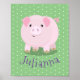 It's pig fun! This adorable potbelly pig will add some happiness to a child's room . Drawn in cute cartoon illustration style on a light green polka dot background.
