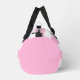 Cute girly duffle bag design. This design features Personalised text in modern hot pink script and pattern of white stripes on a light pink background. You can personalise with a first or last name. This modern girly hot pink duffle bag will be perfect as personalised gift.